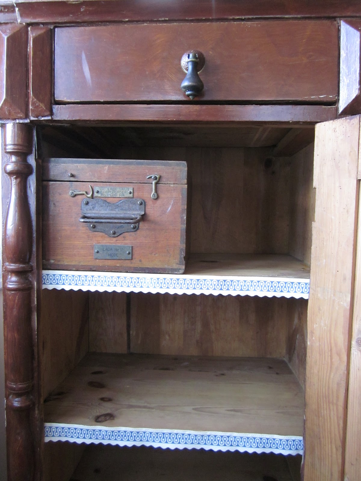 För att piffa upp det lilla drängaskåpet, satte jag dit denna söta "hyllspets", kan det heta så?